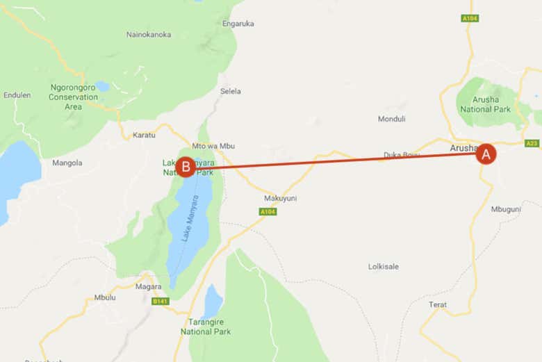 Di seguito, potete vedere l'ubicazione del Parco Nazionale del Lago Manyara rispetto ad Arusha: