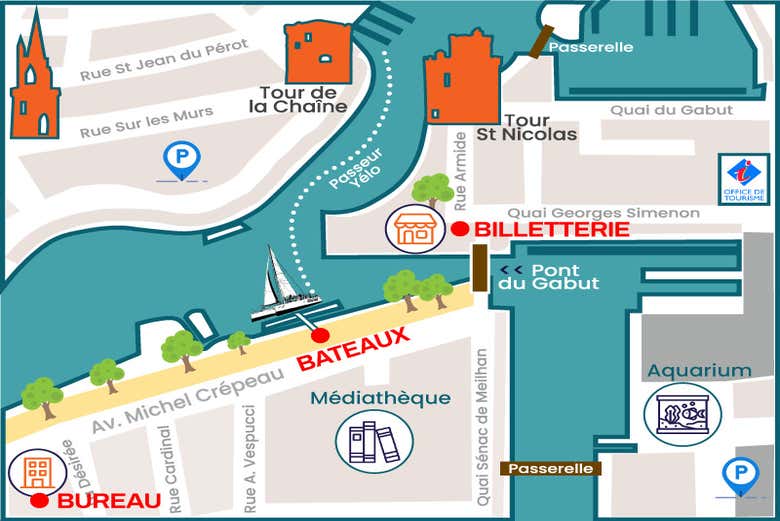 Nell'immagine seguente, potete vedere una mappa con la posizione esatta del punto d'imbarco (dovete imbarcarvi nel punto contrassegnato con "BATEAUX"):
