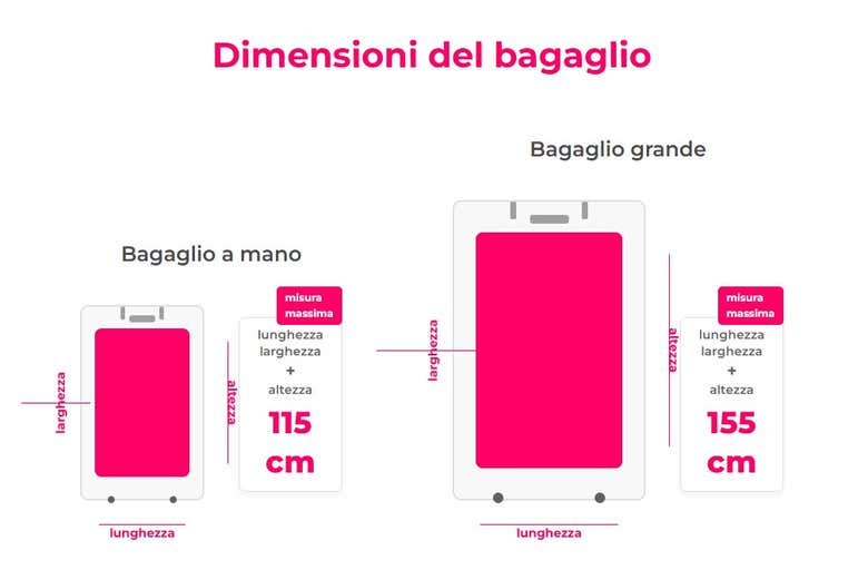 Ciascun passeggero potrà portare con sé una valigia grande e una bagaglio a mano. Di seguito vi indichiamo le dimensioni di ciascun bagaglio: