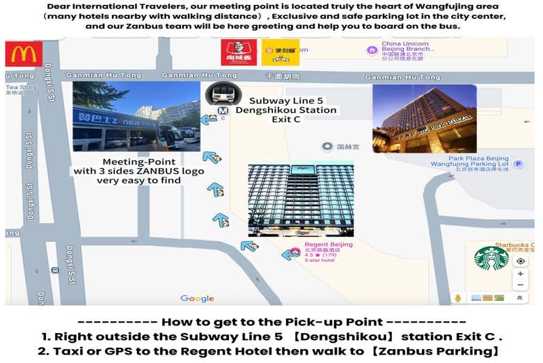Il luogo di incontro è all'uscita C della metropolitana Dengshikou a Pechino, da dove partirà il gruppo. Si consiglia di arrivare alcuni minuti prima per facilitare la partenza puntuale.