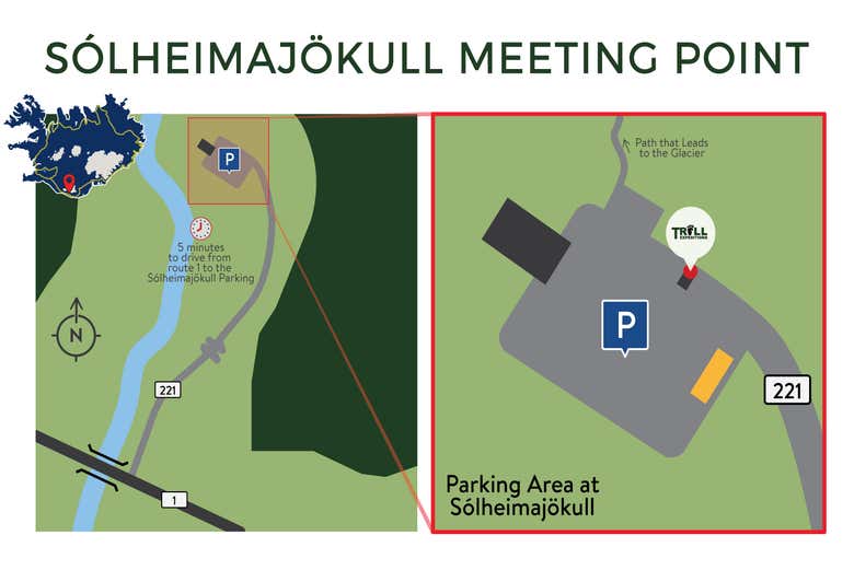 Ci incontreremo presso Tröll Expeditions Sólheimajökull, concretamente alla roulotte dell'azienda Tröll Expeditions. Vi preghiamo di raggiungere il punto d'incontro almeno 15 minuti prima dell'inizio del tour.