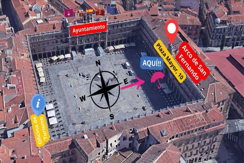 La guida vi aspetterà al numero 10 di Plaza Mayor, proprio accanto all'Arco di San Fernando, tra la pasticceria Santa Lucía e la farmacia. Vi preghiamo di arrivare almeno 15 minuti prima dell'orario indicato.