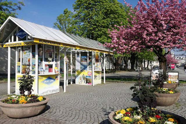 L'ufficio della Gray Line di Salisburgo è bianco e giallo e si trova accanto ai giardini di Mirabell.