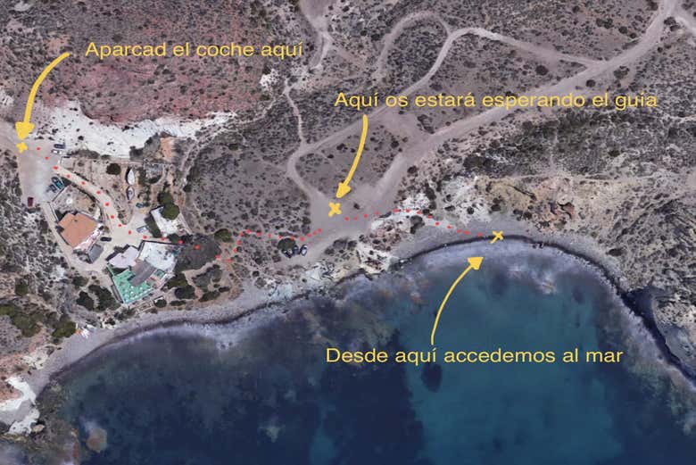 Vi aspetteremo vicino a Cala Higuera all'ora indicata. Vi preghiamo di arrivare con 10 minuti di anticipo. Nell'immagine seguente potete vedere meglio la posizione esatta del punto di incontro: