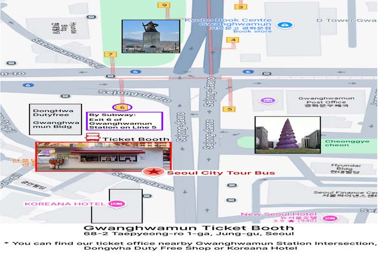 Prima di salire a bordo dell'autobus, dovrete cambiare il vostro biglietto presso l'ufficio del Seoul City Tour Bus, situato nel seguente punto della capitale sudcoreana: https://maps.app.goo.gl/MSDP62J8m3fGhKM66.